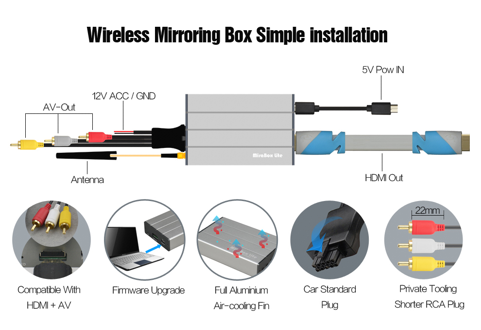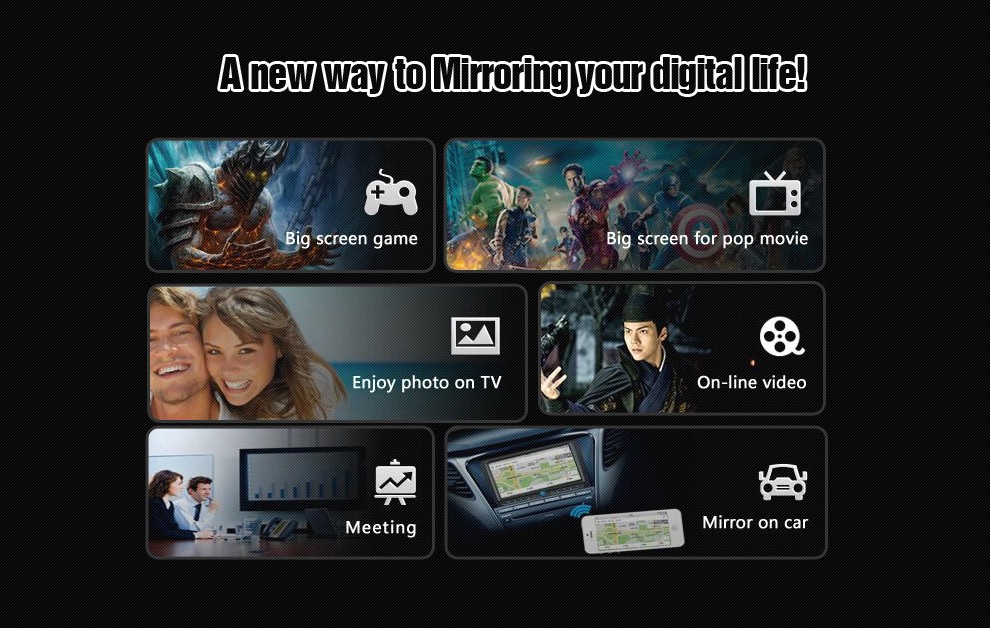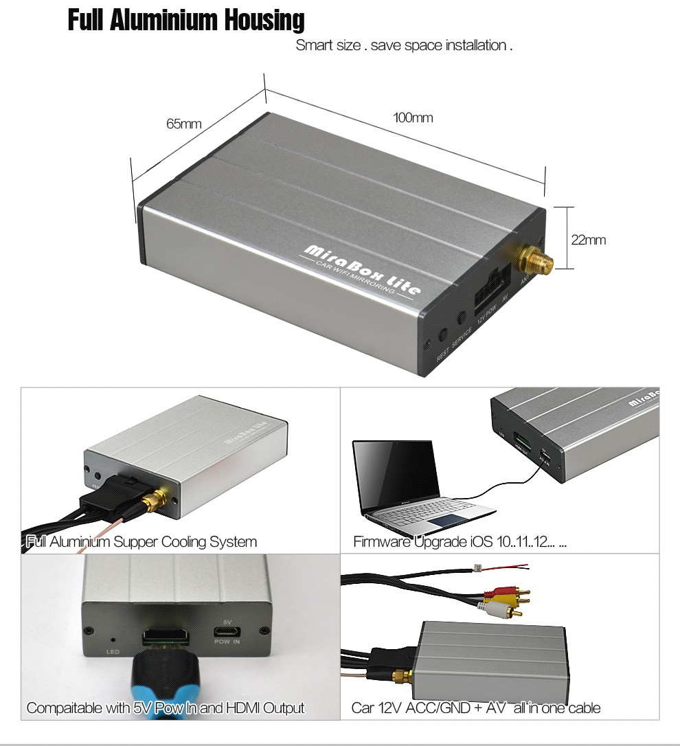MiraBox-Lite เป็นอุปกรณ์แชร์ภาพจากมือถือ ไปยังหน้าจอคอมพิวเตอร์ หรือ ทีวี ด้วยพอร์ต HDMI /CVBS ทำหน้าที่เป็นตัวกลางเชื่อมต่อผ่าน wifi 2.4 รองรับ WIFI MIRACAST agreement AIRPALY Mirroring agreement and the DLNA agreement