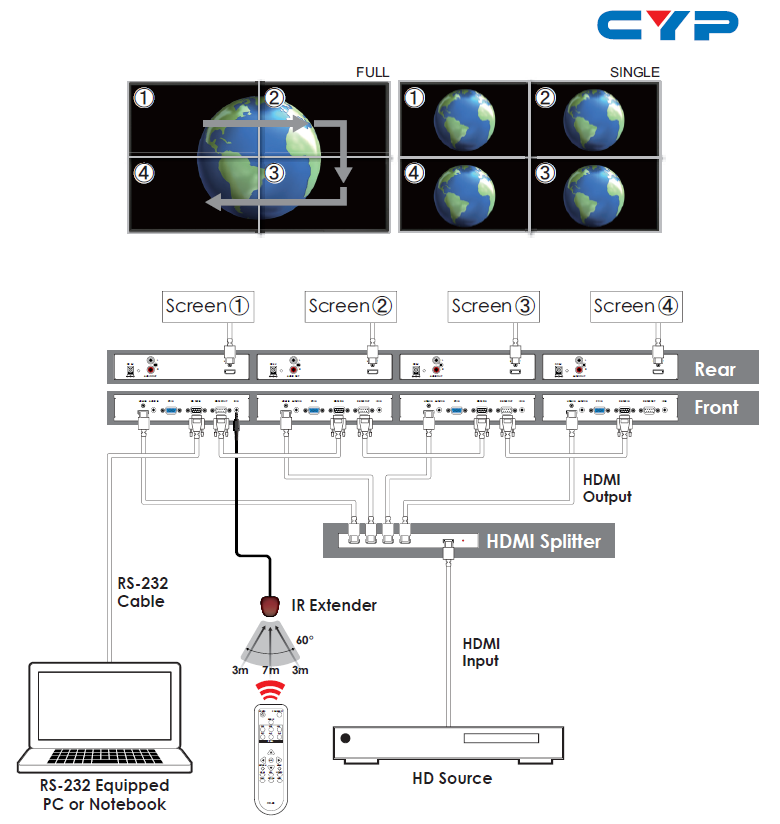 Video Wall Multi-Screen เหมาะสำหรับการโฆษณา, ความบันเทิง และ แสดงข้อมูลข่าวสาร อุปกรณ์นี้จะช่วยให้แสดงภาพจากแหล่งสัญญาณ HDMI หรือ จากเครื่องคอมพิวเตอร์ไปยังจอ LCD หลายจอ อีกทั้งยังมีพอร์ต RS-232 ทำให้สามารถที่จะปรับแต่ง และ ควบคุมการแสดงผลไปยังหลายจอ LCD ได้อย่างสมบูรณ์แบบ เช่น 2x2, 3x3, 4x4 และ 5x5