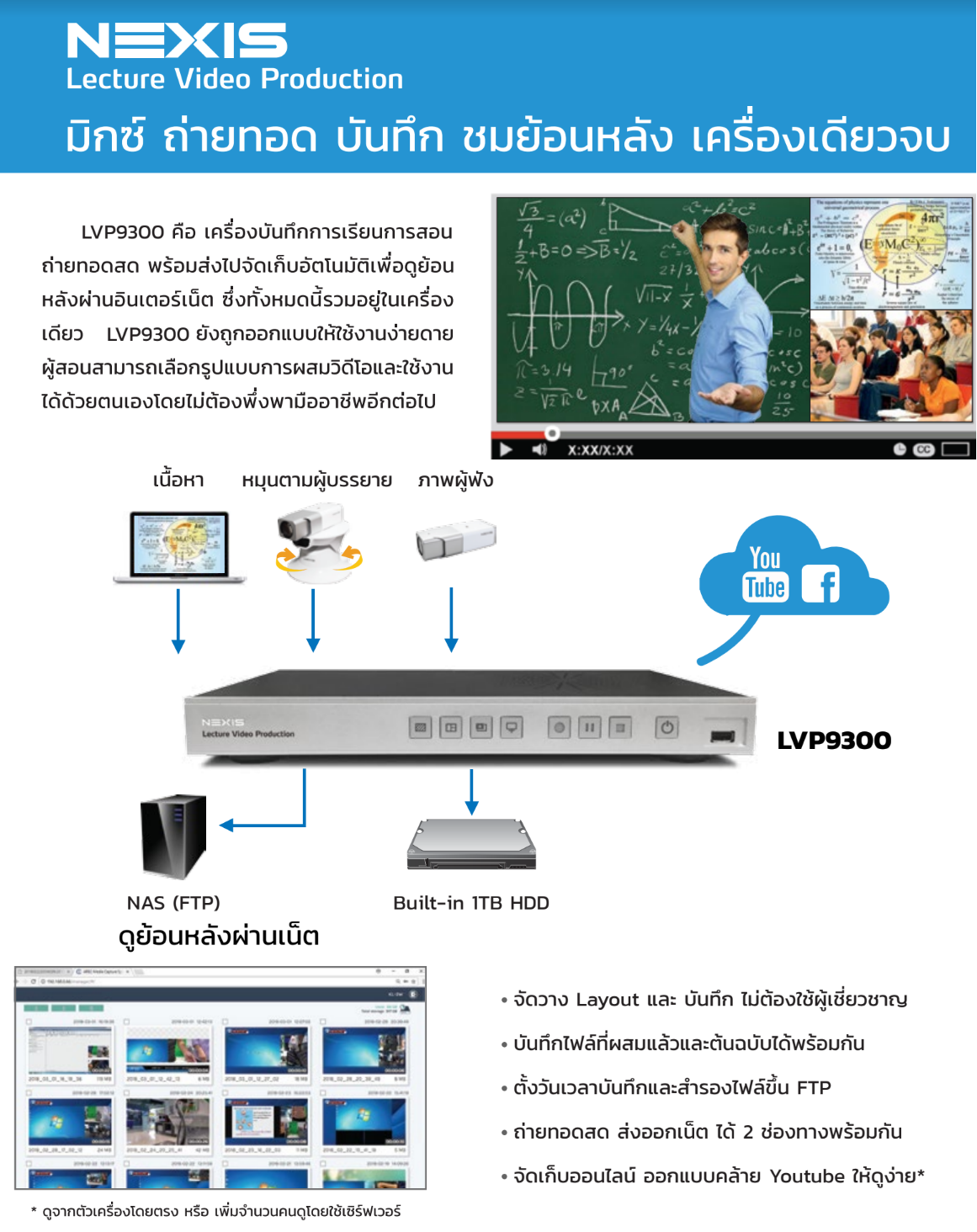 Nexis Lecture Video Production คือเครื่องบันทึกการเรียนการสอน ถ่ายทอด และส่งไปจัดเก็บ Online ในเครื่องเดียว ครูสามารถติดตั้งใช้งานได้เอง โดยไม่ต้องเพิ่งมืออาชีพอีกต่อไป *มี Option เป็น Auto-Tracking ทำให้กล้องหมุนไปตามผู้สอนอันโนมัติ